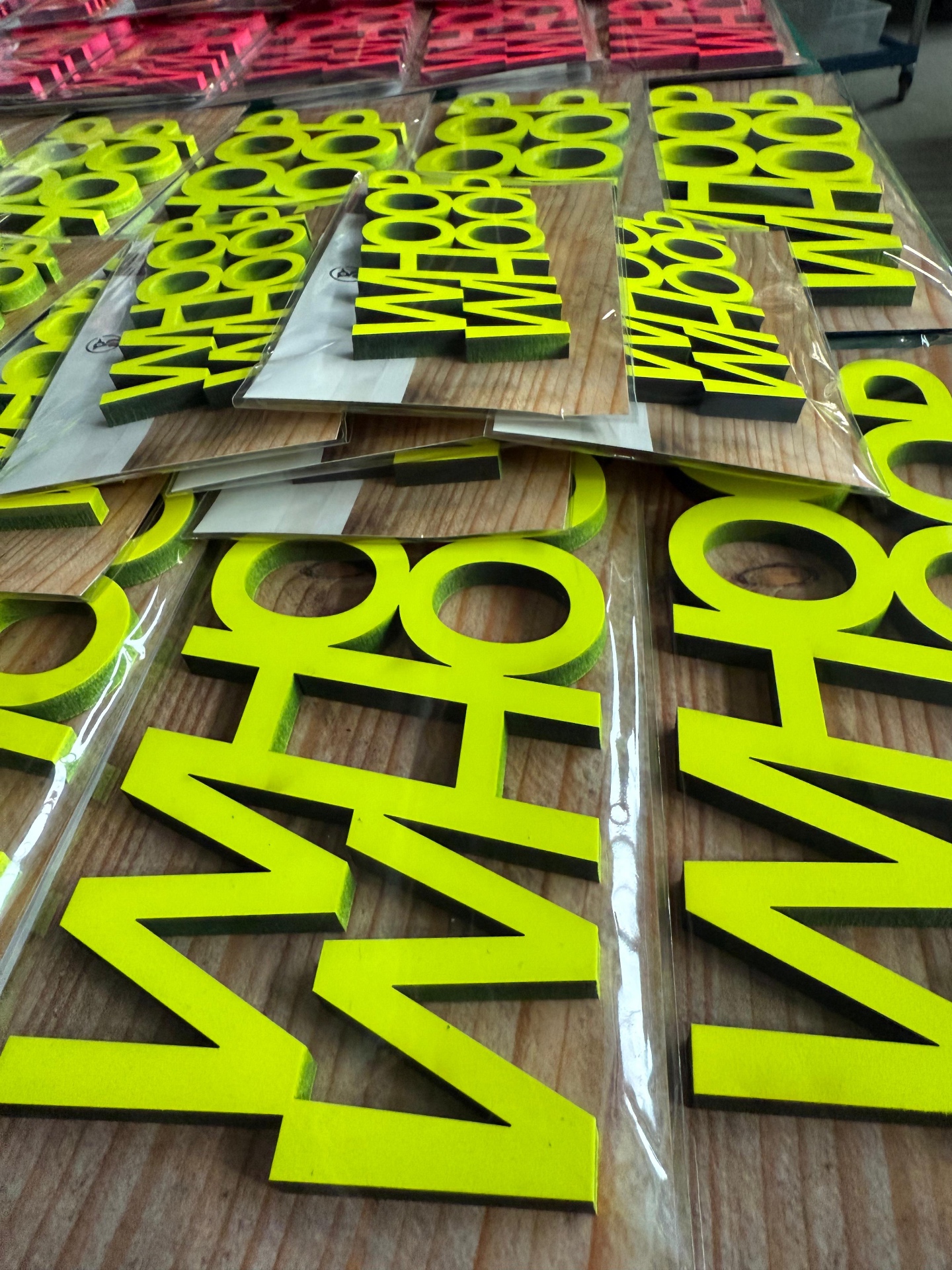 Ein Blick in unsere tägliche Produktion: Hochzeitsdeko, Hausnummern, Eventbeschriftung, Großserien für Marken — alles auf denselben Maschinen, vom selben Team.